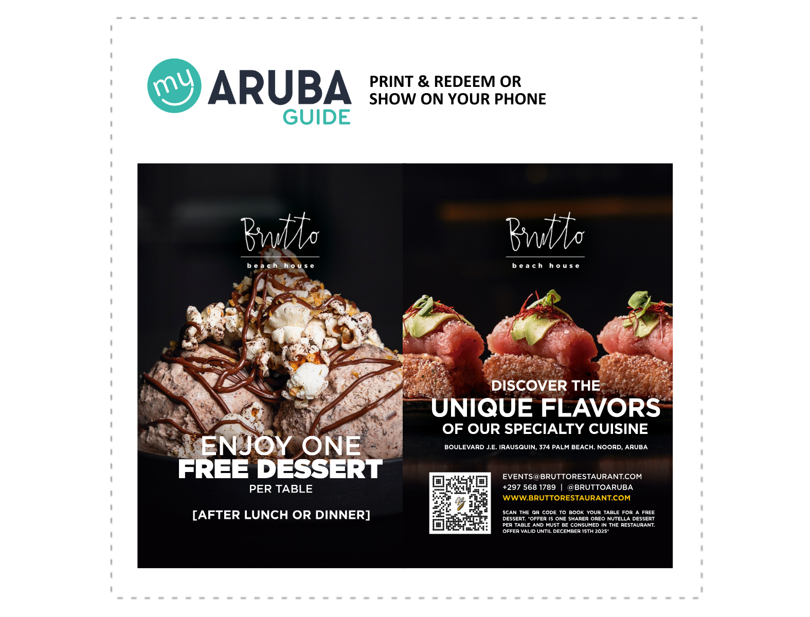 ¿Qué mejor manera de disfrutar de su estancia en Aruba que saboreando un delicioso postre gratis y degustando la cocina urban-chic de Brutto? Brutto ofrece productos de alta calidad bajo el concepto de «comidas para compartir». Permita que sus papilas gustativas disfruten de la experiencia definitiva. Presente o muestre este cupón para canjear un postre gratis en Brutto.