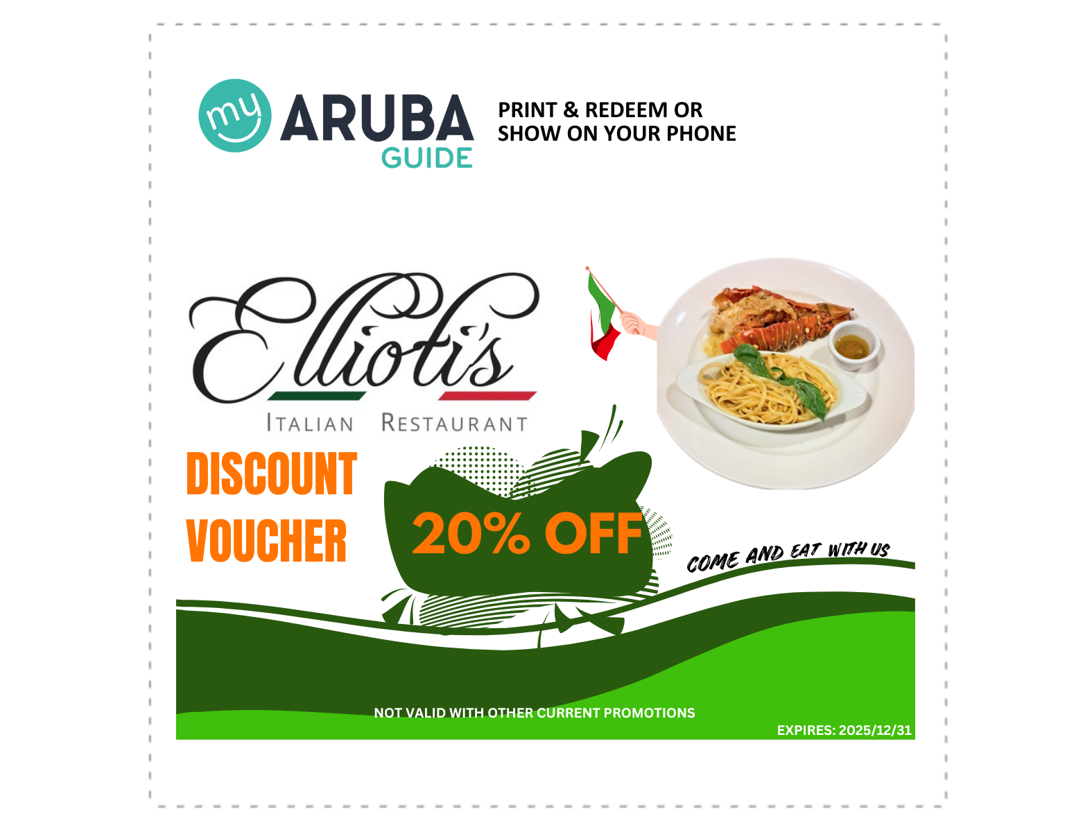 Apresente ou mostre este cupom para resgatar 20% de desconto na deliciosa e autêntica culinária italiana do Ellioti's. Não há nada melhor do que saciar a barriga depois de um dia divertido e relaxante em Aruba.