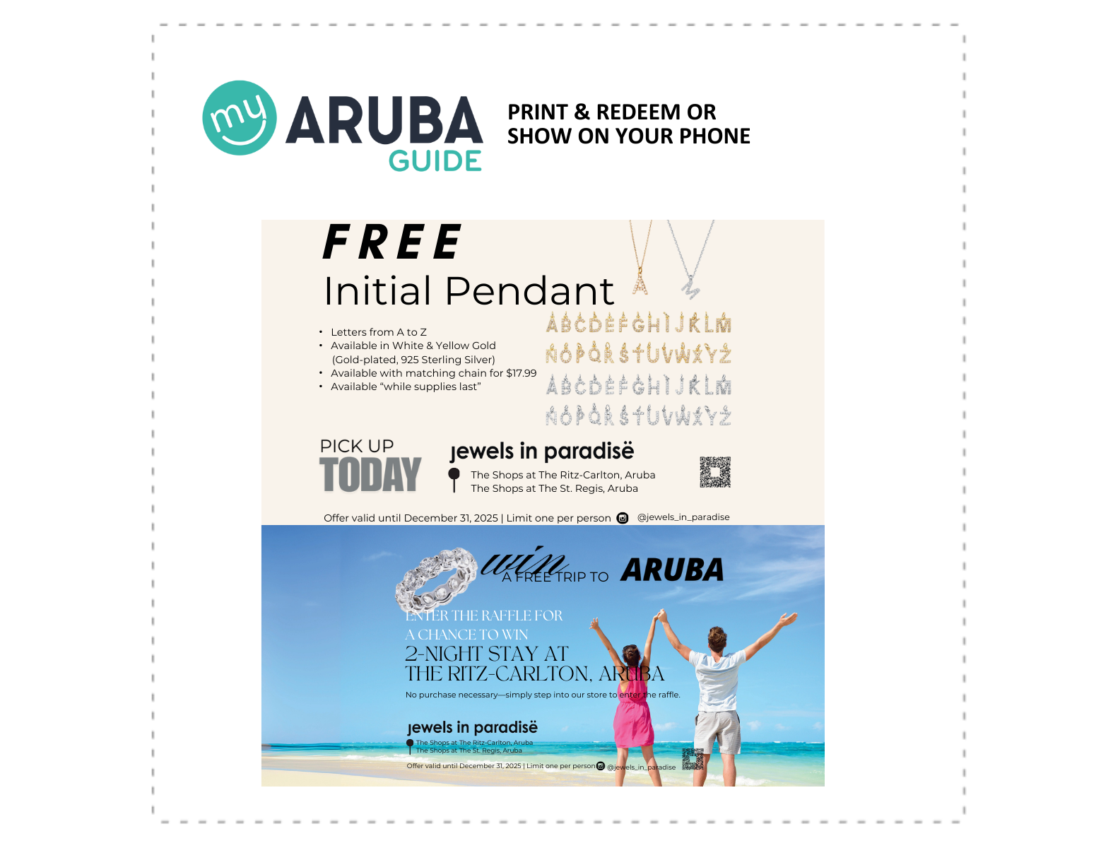 Apresente ou mostre este cupom para resgatar um pingente inicial grátis da Jewels in Paradise e ter a chance de ganhar uma viagem grátis para Aruba e uma estadia de 2 noites no hotel The Ritz-Carlton. Disponível em ouro branco e amarelo e com corrente combinando por apenas US$ 17,99. Compre hoje mesmo e o único passo para participar do sorteio é visitar a loja. Uma maneira fácil de manter um visual glamouroso enquanto aproveita sua estadia em Aruba.